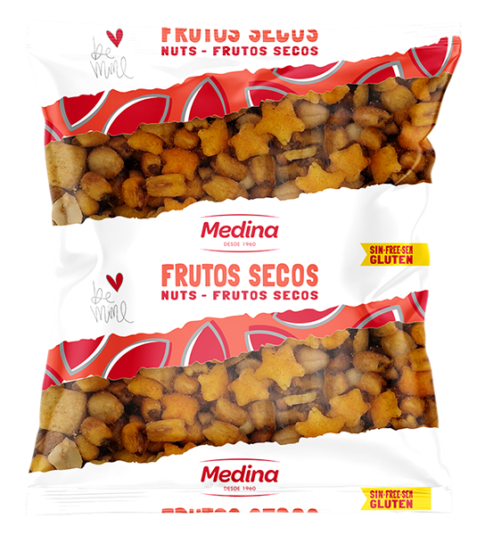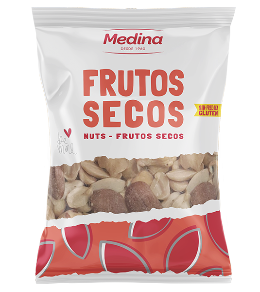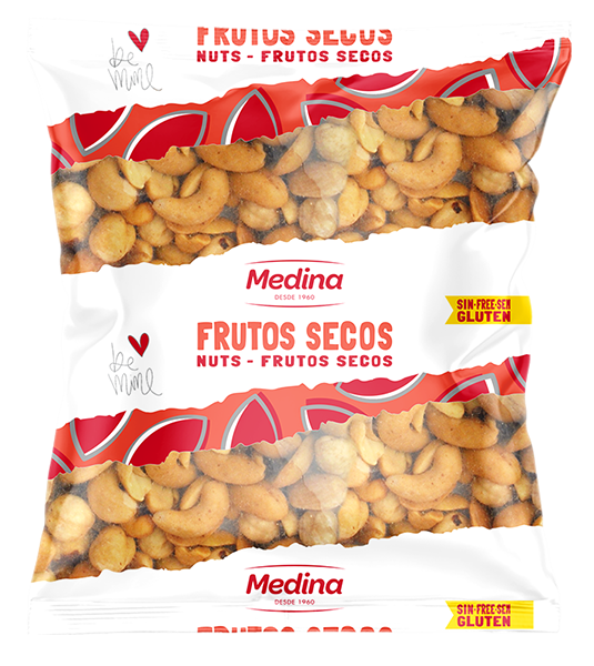 INGREDIENTES: (1) CACAHUETE repelado frito 55% (CACAHUETE, aceite de girasol alto oleico y sal), (2) ALMENDRA comuna frita 15% (ALMENDRA, aceite de girasol alto oleico y sal), (3) ANACARDO frito 15% (ANACARDO, aceite de girasol alto oleico y sal), (4) AVELLANA tostada 15% (AVELLANA). Puede contener trazas de otros frutos de cáscara.