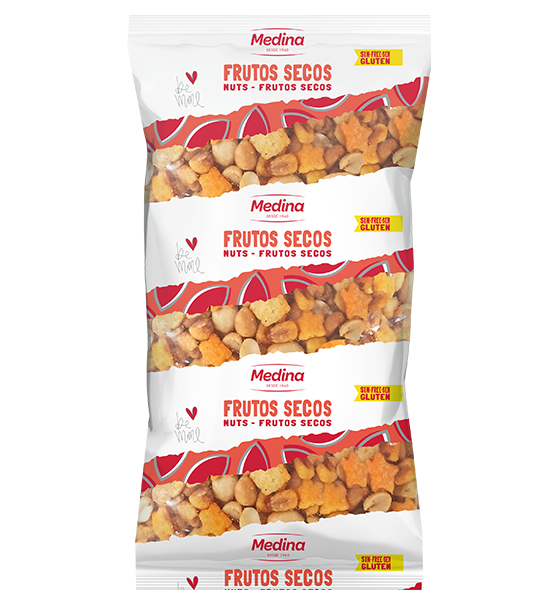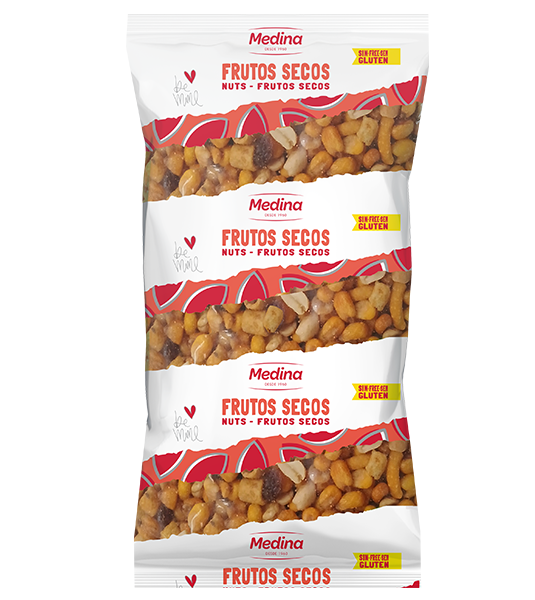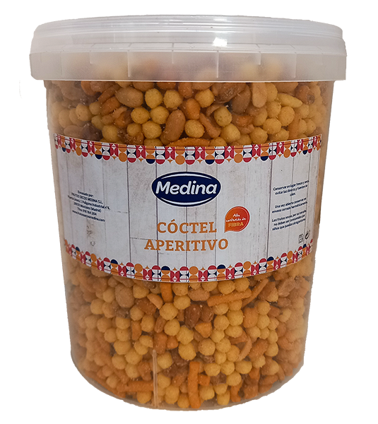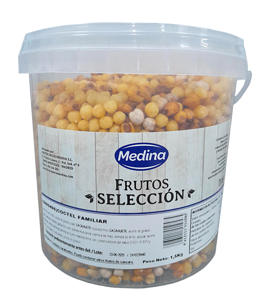 INGREDIENTES: (1) Maíz frito (Maíz, aceite de girasol y sal), (2) CACAHUETE repelado frito (CACAHUETE, aceite de girasol y sal), (3) uvas pasas (uva pasa y aceite de girasol), (4) kiko chip tubo barbacoa (Maíz, aceite de girasol, maltodextrina, sal, aroma, acidulante (E-330), aroma de humo), (5) snack corn chip stick tex-mex (Maíz, aceite de girasol, sal, aroma, colorante (E-160c, E-160(ii), acidulante (E-330), antioxidante (E-306) y (6) habas fritas (Habas, aceite de girasol y sal). Puede contener frutos de cáscara y trazas de leche.